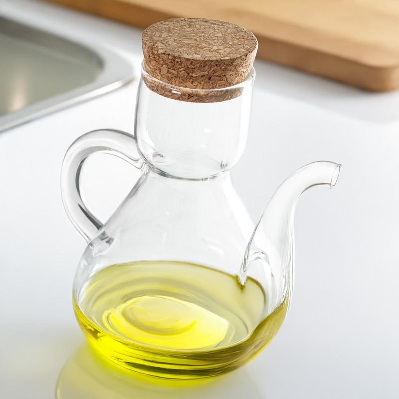 Aceitera de cristal borosilicato de 500ml con tapon de corcho transparente. Medidas: 12x12x15.5 cm