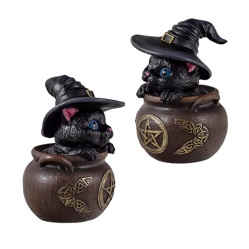 Figura gato brujo dentro de un caldero de resina pintado a mano. Medidas: 7x10 cm