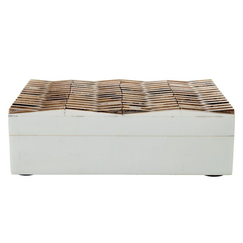 Caja rectangular de resina con base de madera marron hueso y blanco. Medidas: 18x5x13 cm