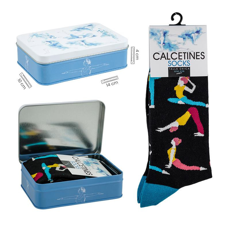 Calcetines de yoga negros con estuche de lata. Medidas: 14x4x10 cm
