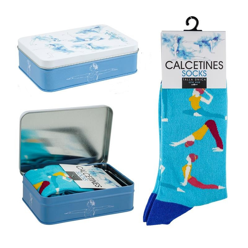 Calcetines de yoga azul con estuche de lata 10x14x4 cm