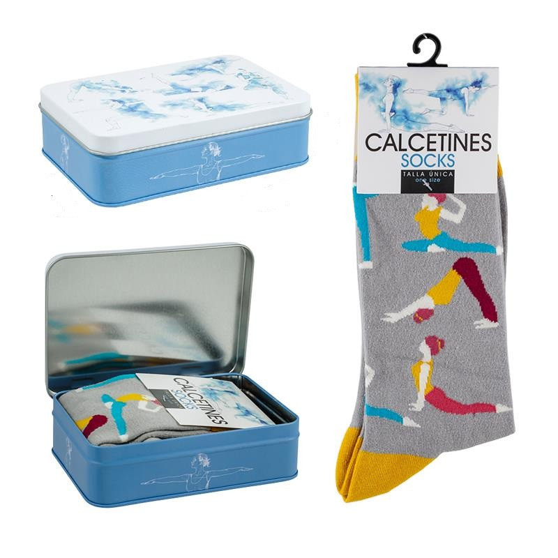 Calcetines de yoga grises con estuche de lata 10x14x4 cm