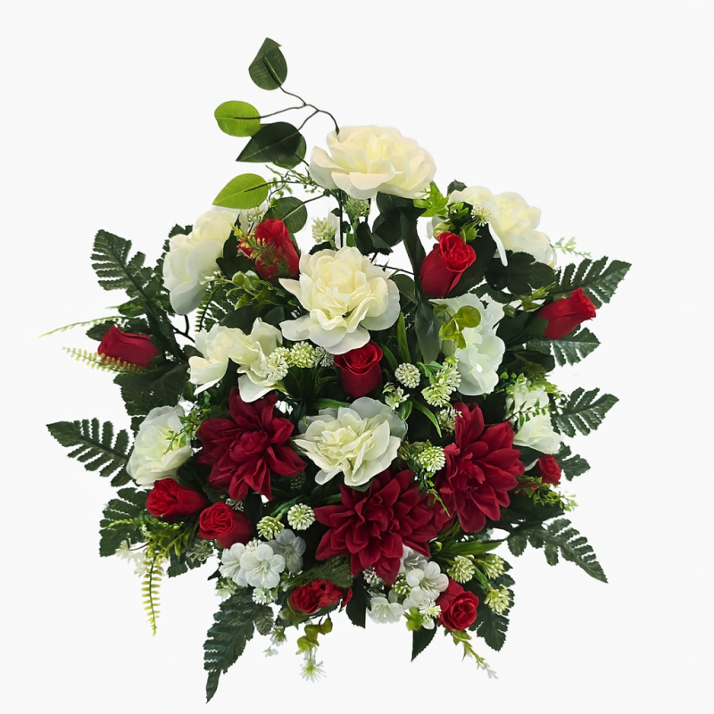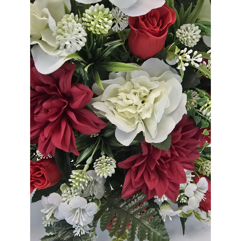Centro de flores artificiales para bodas, iglesias, cementerios con dalias y rosas blanco y rojo 57x66x25 cm