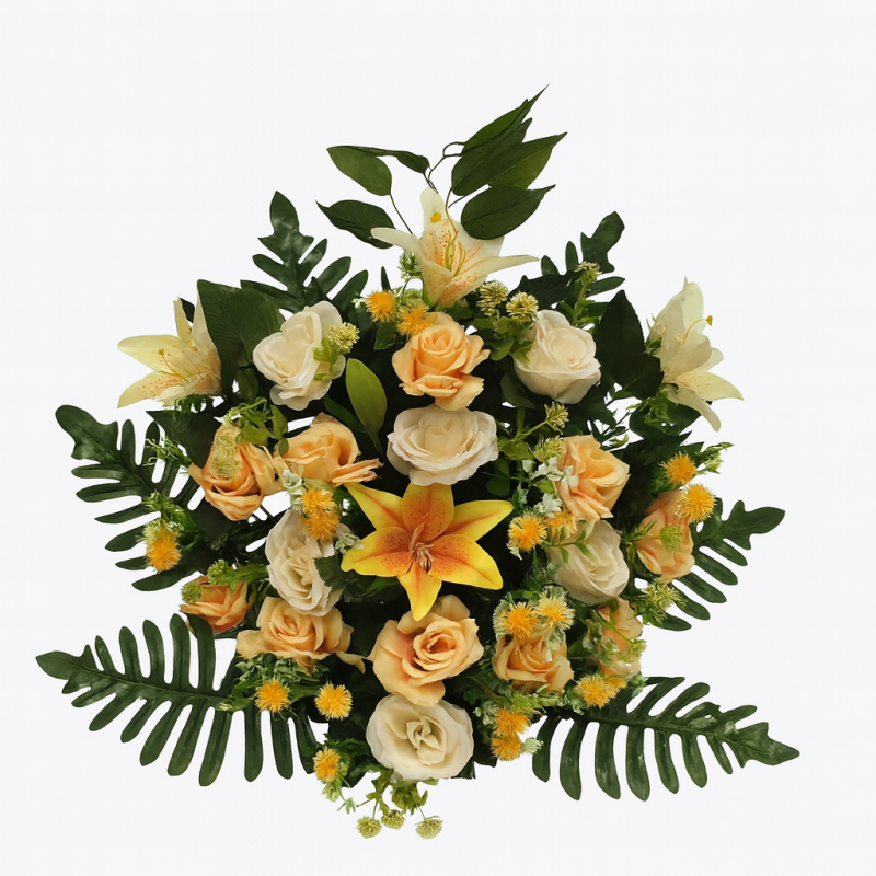 Centro de flores artificiales para bodas, iglesias, cementerios con rosas naranjas liliums beige 60x60x30 cm