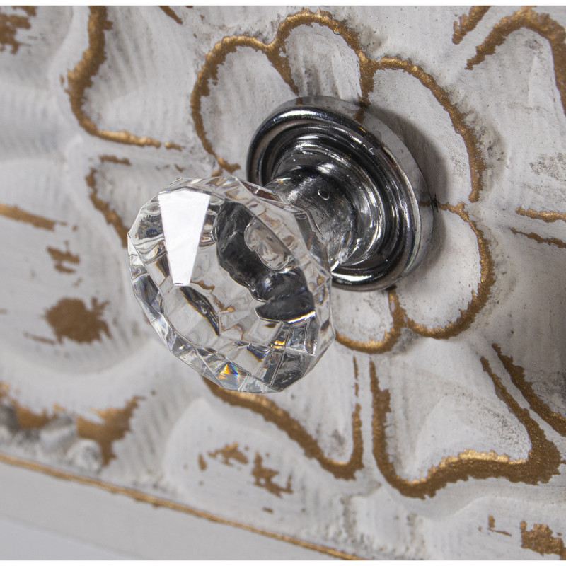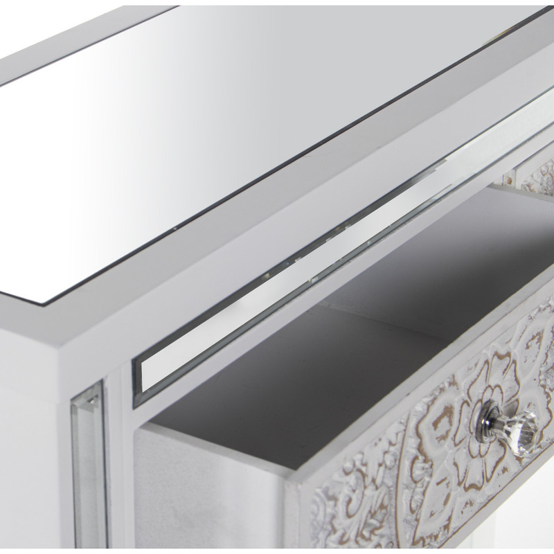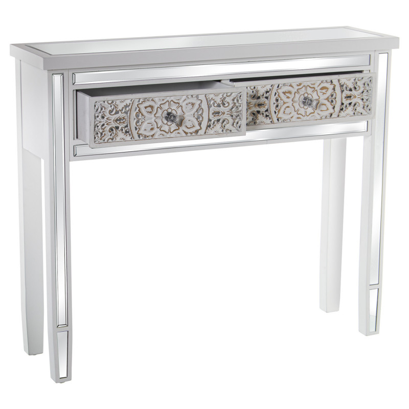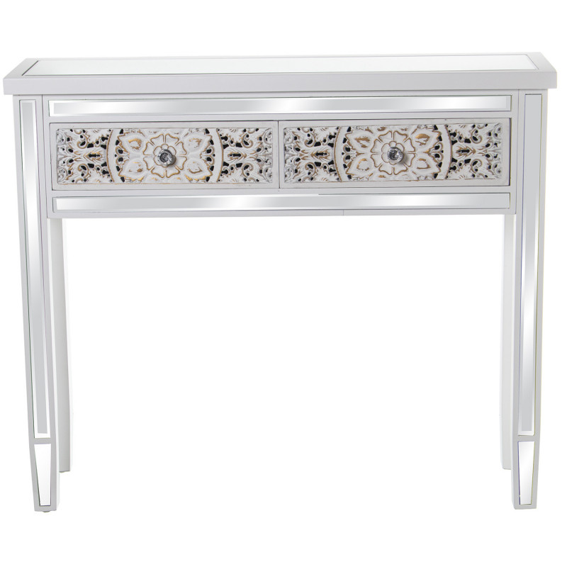 Mesa de Entrada con 2 Cajones de Madera Tallada y Espejo en Blanco Decape 95x26x80cm
