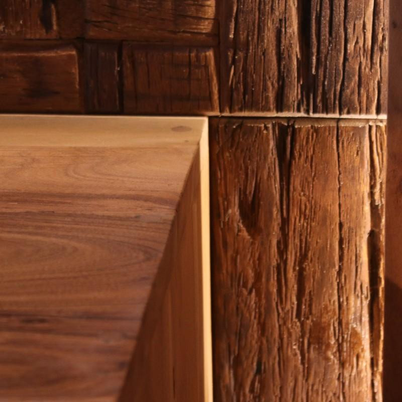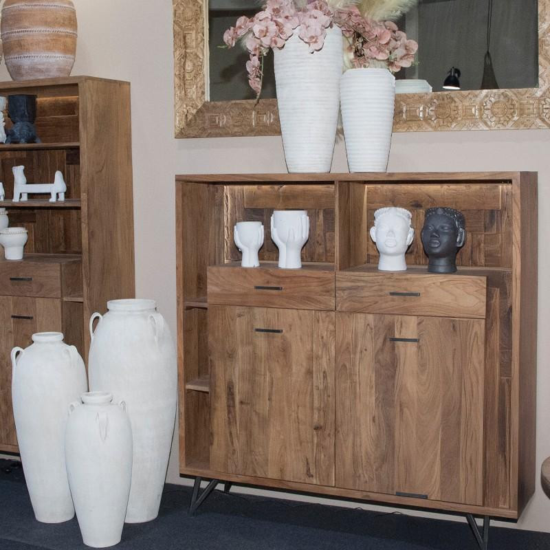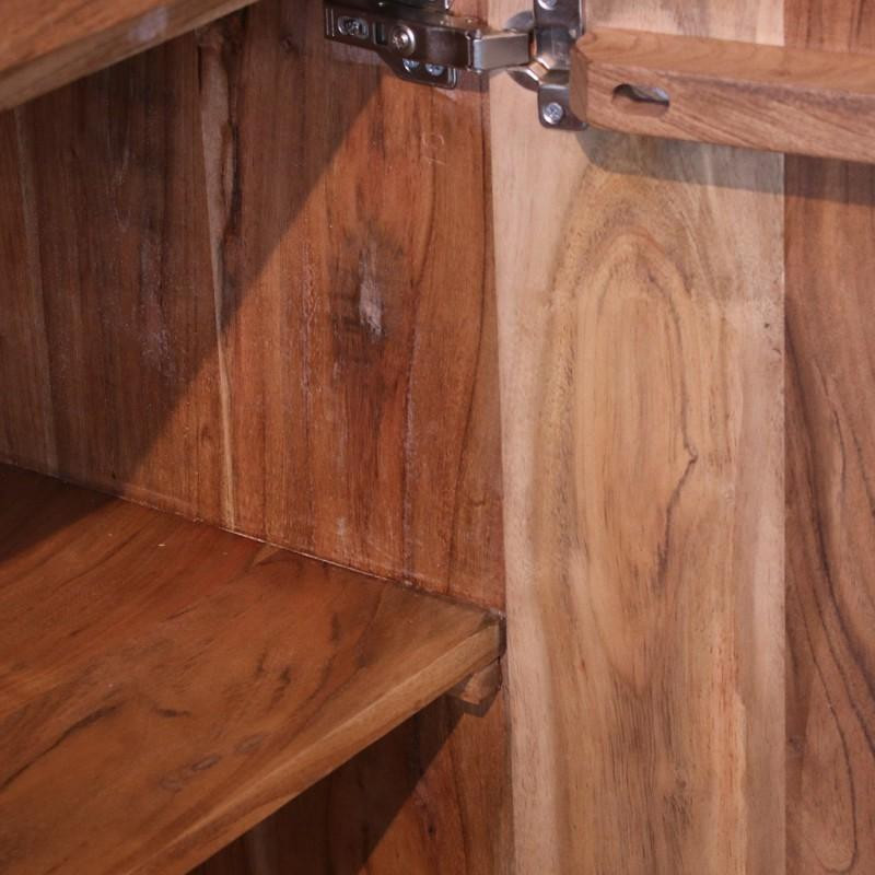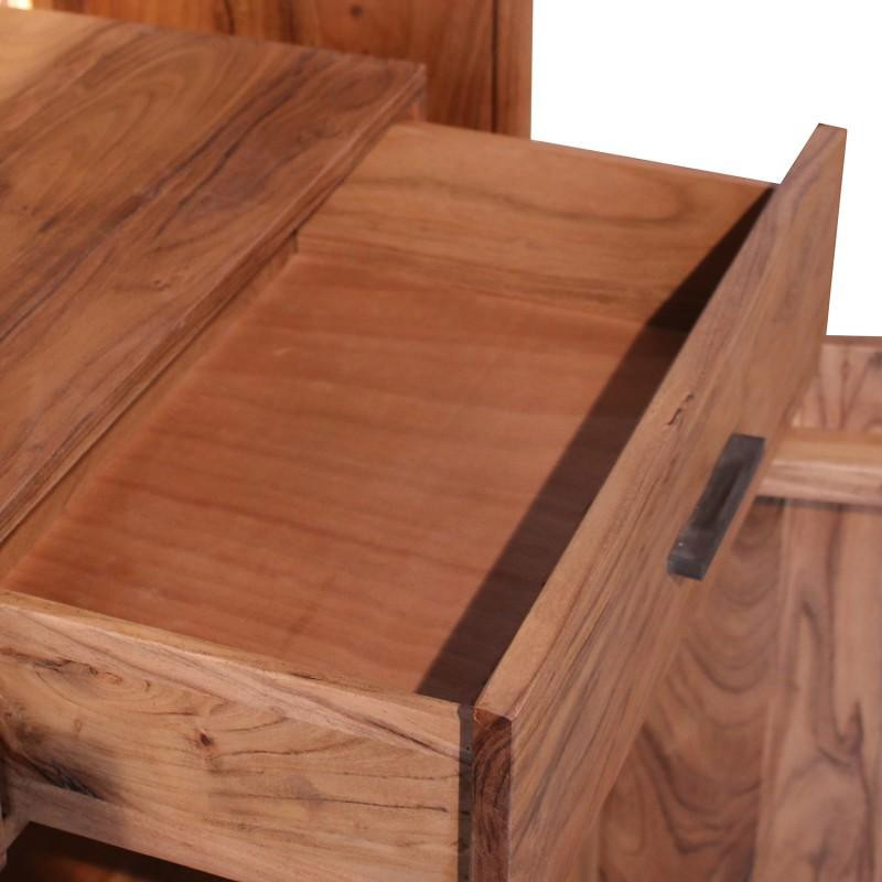 Mesa de entrada con 2 cajones y 2 puertas de madera con luz led y patas de metal natural 150x145x40 cm
