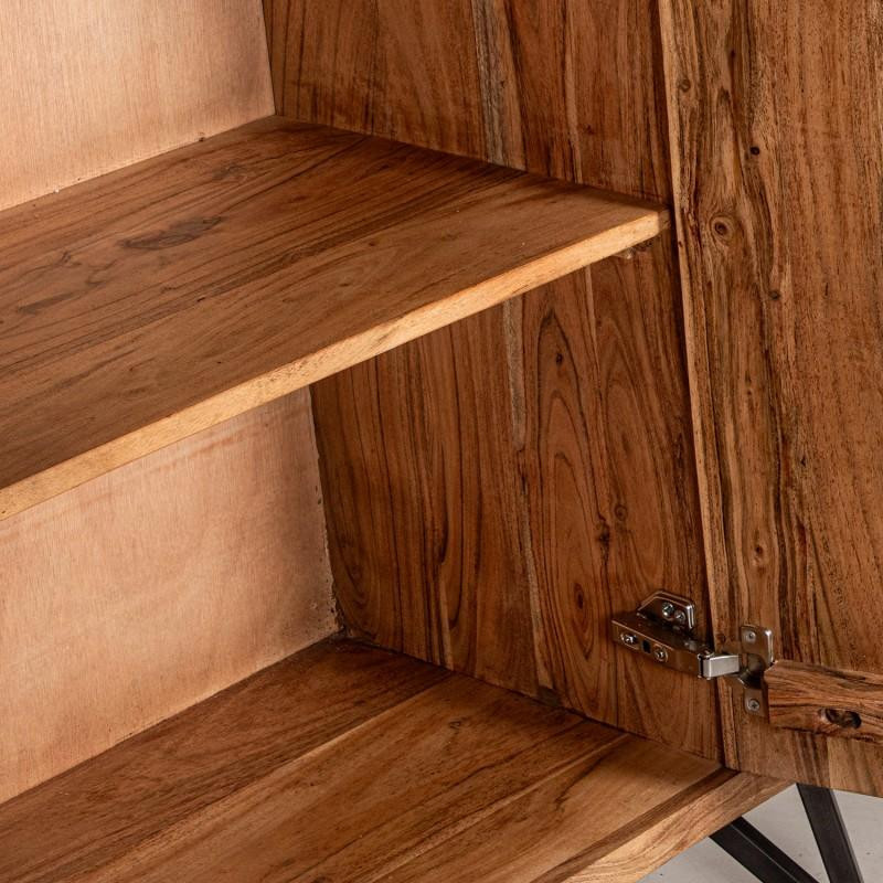 mesa de entrada con 2 cajones y 2 puertas de madera y patas de metal en natural y negro 150x145x40cm