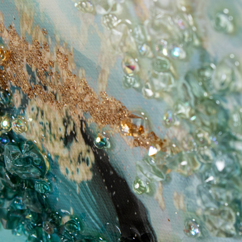 Set de 2 cuadros abstractos con marco de madera en verde y dorado. Medidas: 102x3.2x52 cm
