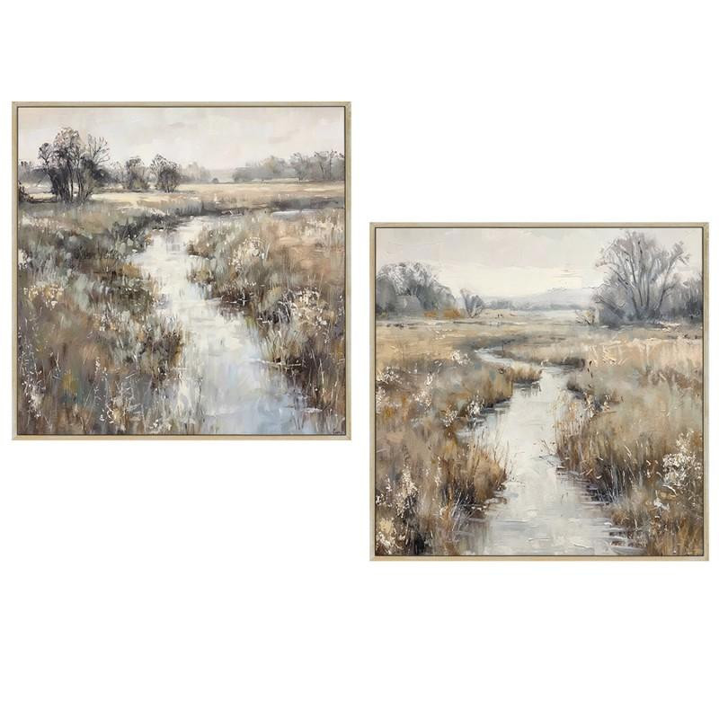 Set de 2 cuadros lienzo de un rio con marco de madera natural en blanco, verde y beige. Medidas: 40x40x1.9 cm
