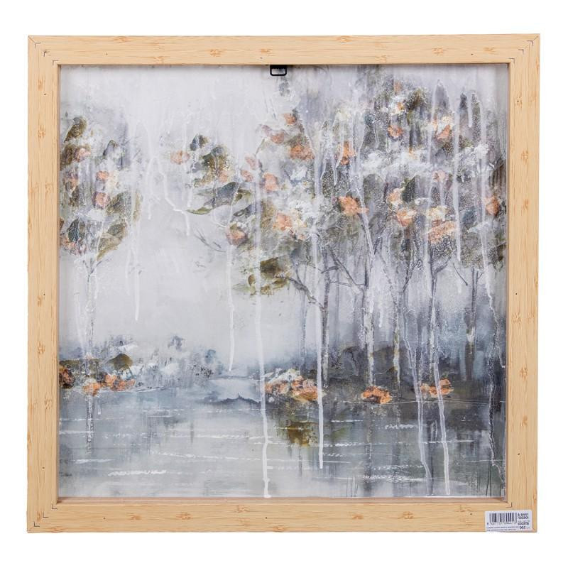Set de 2 cuadros lienzo con un paisaje de rio y marco de madera natural en blanco, verde y gris. Medidas: 60x60x3.5 cm