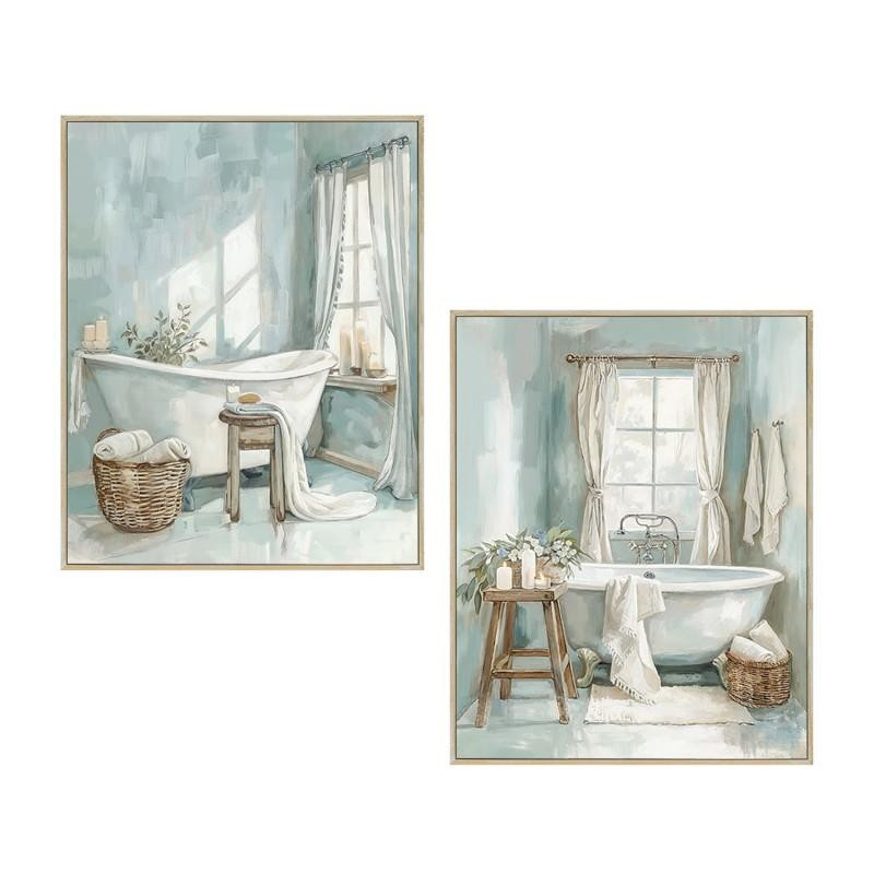 Set de 2 cuadros lienzo con bañeras y con marco de madera natural en blanco, azul y marron 40x50x1.9 cm