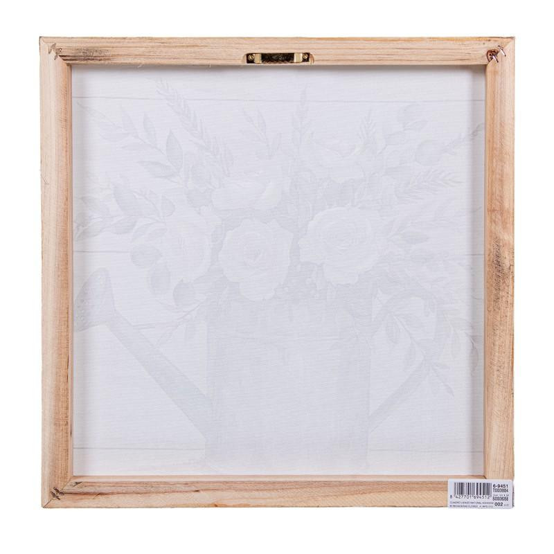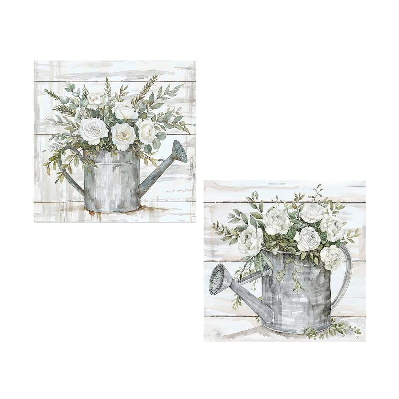 Set de 2 cuadros lienzo natural con regadera y flores en blanco, verde y gris 40x40x3 cm