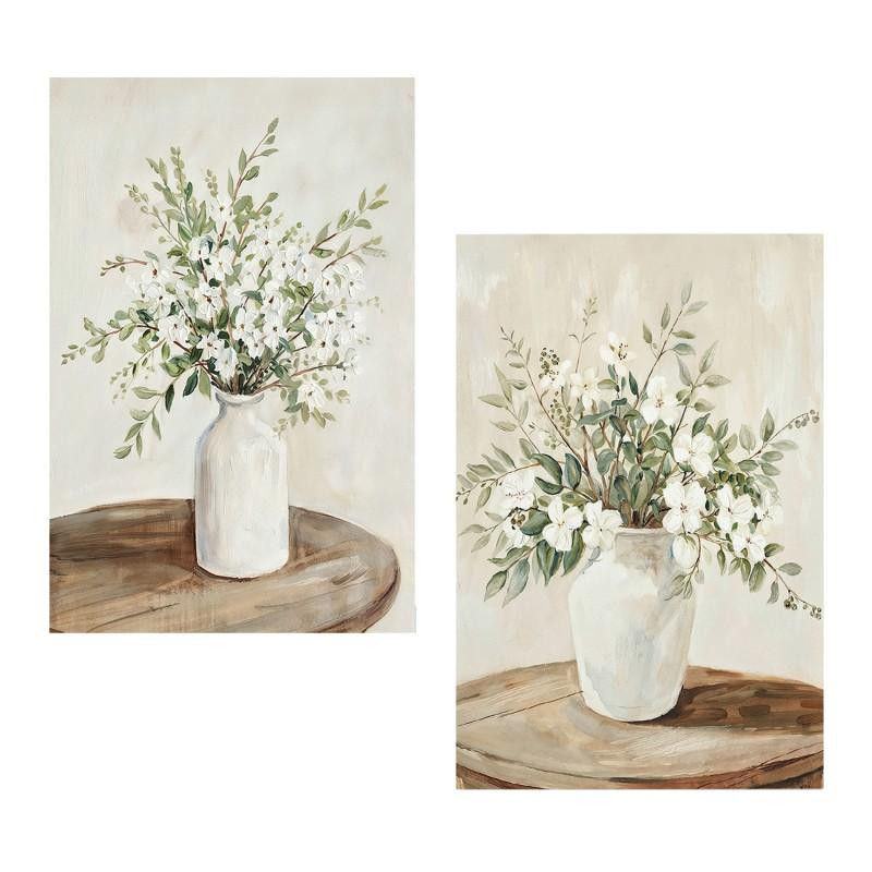 Set de 2 cuadros lienzo natural con jarrones y flores en blanco, verde y marron 40x60x3 cm
