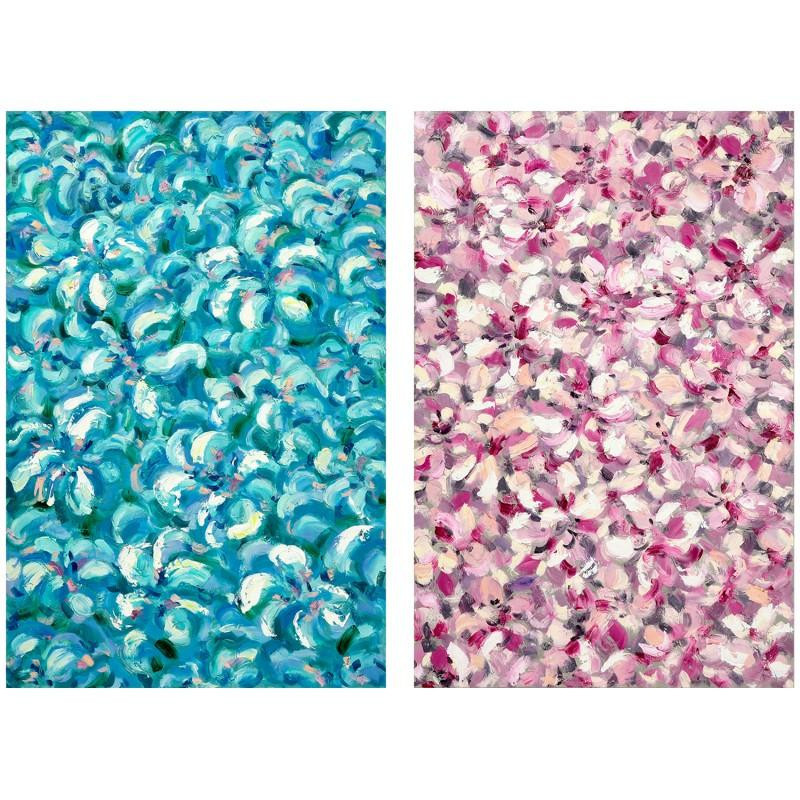 Set de 2 cuadros lienzo natural con flores en rosa y azul. Medidas: 80x120x3 cm