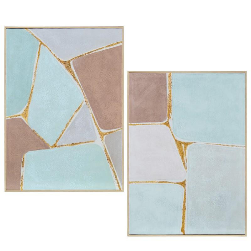 Set de 2 cuadros lienzo abstracto con marco de madera en azul, dorado y amrron 50x70x3.2 cm