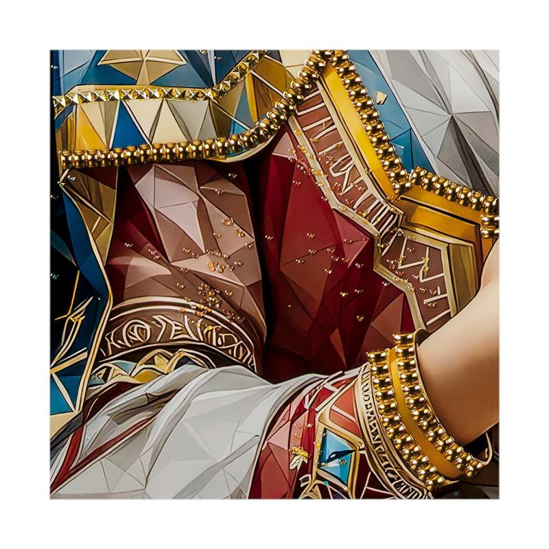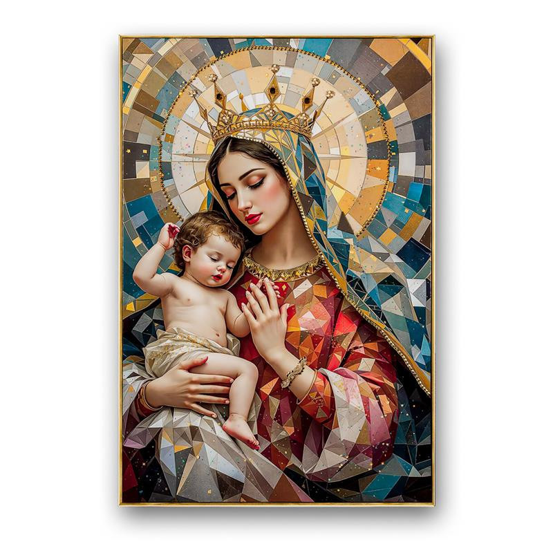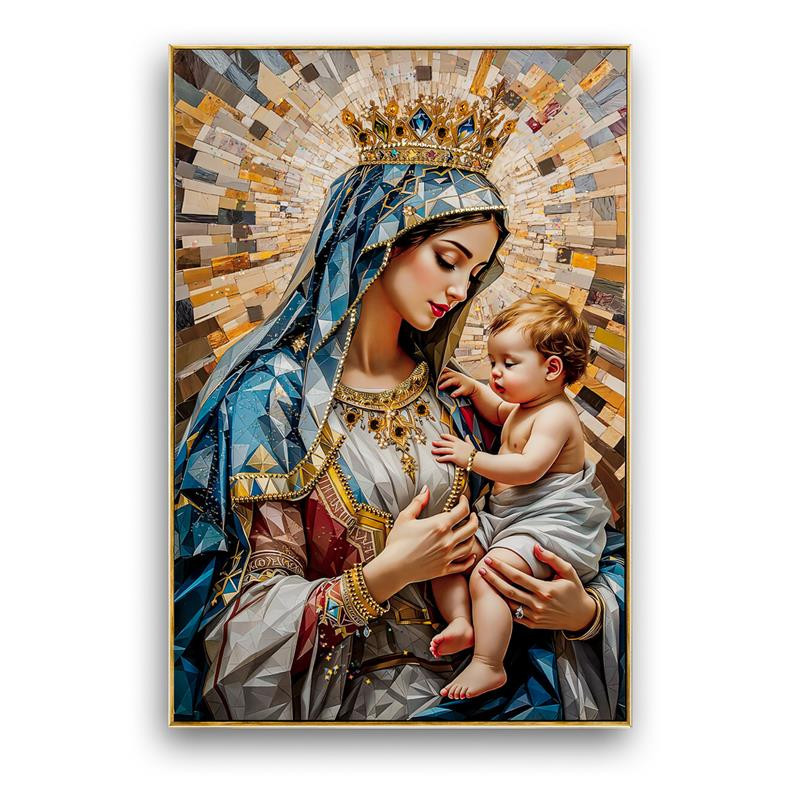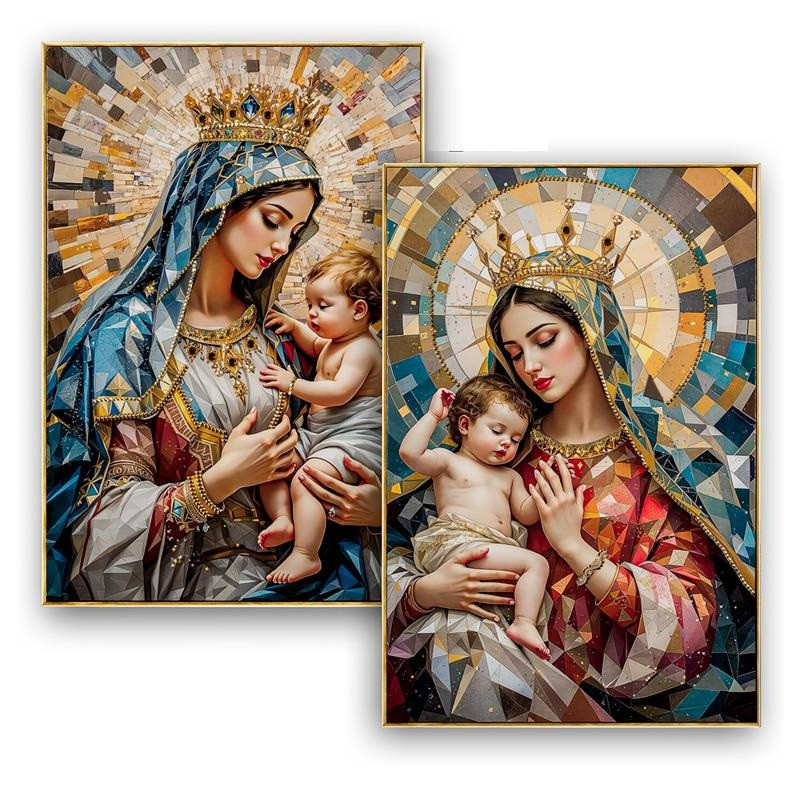 Set 2 cuadros Cuadro Virgen con el niño estilo mosaico geometrico con marco dorado. Medidas: 2x122x82 cm