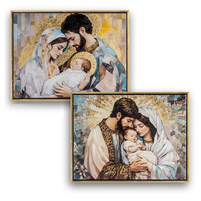 Set 2 cuadros de la Sagrada Familia estilo mosaico geometrico con marco dorado 42x2x42 cm