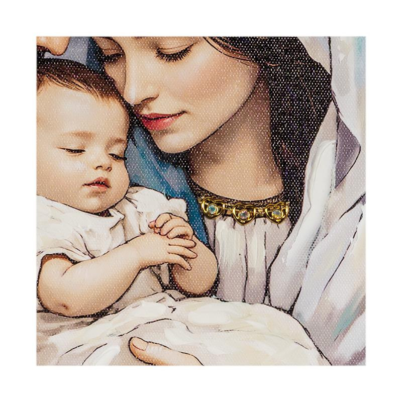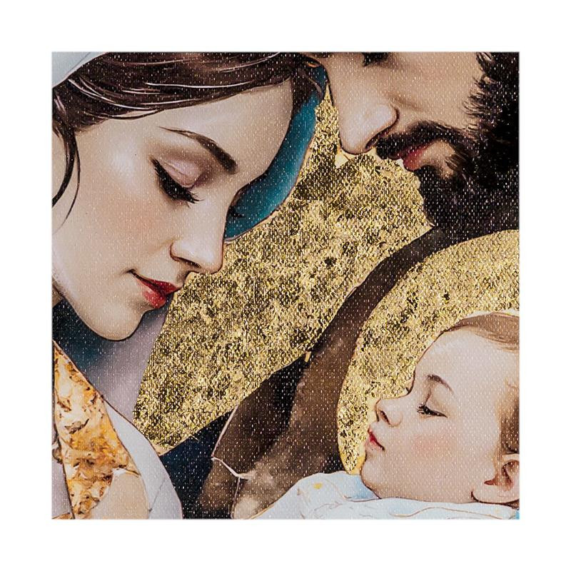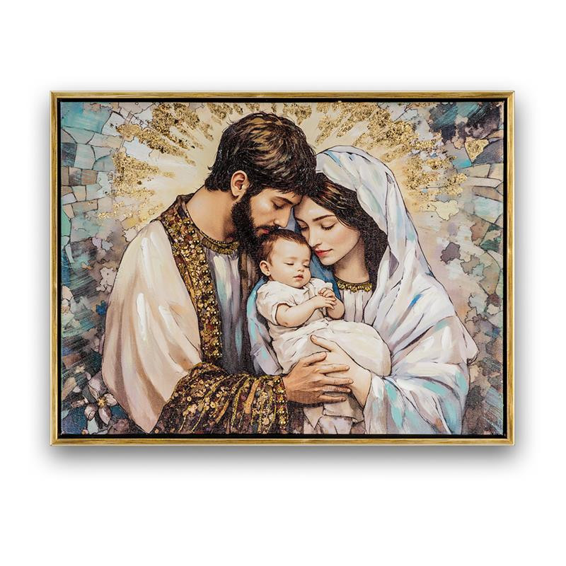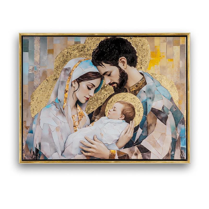 Set 2 cuadros de la Sagrada Familia estilo mosaico geometrico con marco dorado. Medidas: 2x42x42 cm