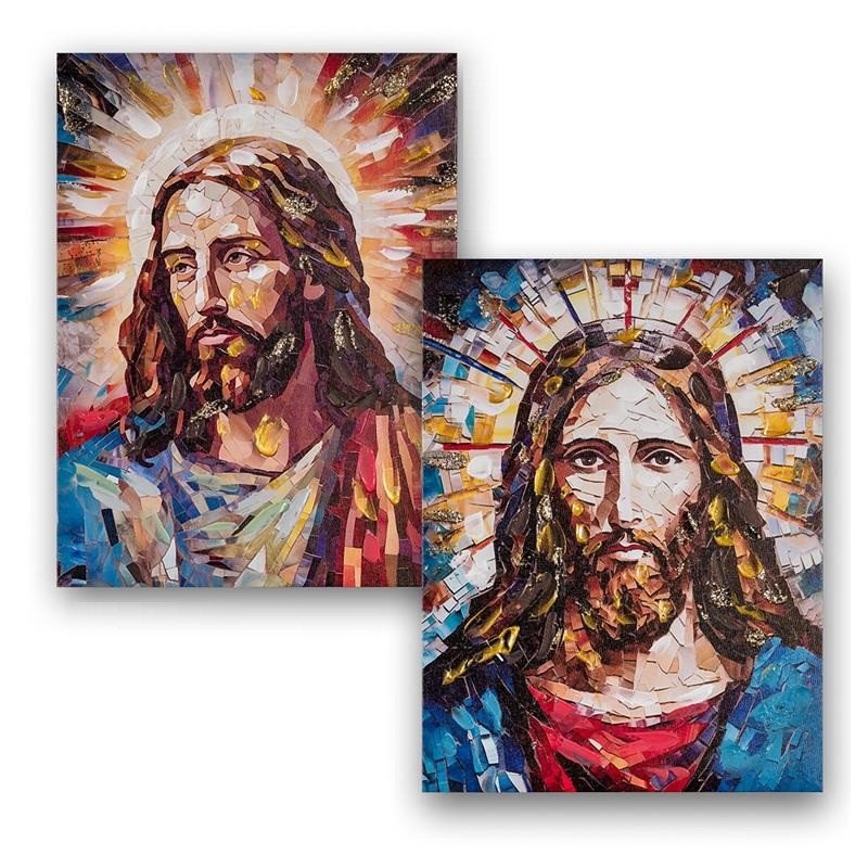 Set 2 cuadros Sagrado Corazon de Jesus estilo mosaico geometrico con marco dorado 32x2x42 cm
