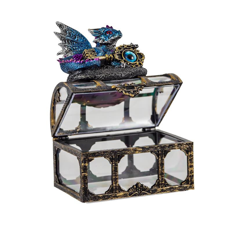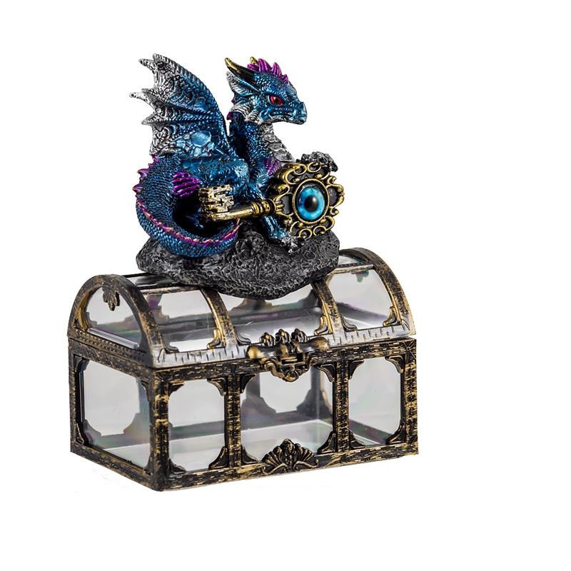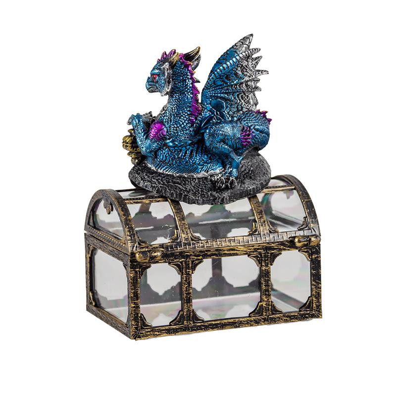 Figura dragon azul sobre baul de resina pintado a mano 7x9x13 cm