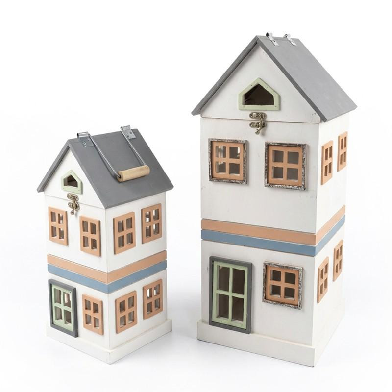 Set de 2 faroles con forma de casa de madera con luz tira de led en blanco 49x22x22 cm