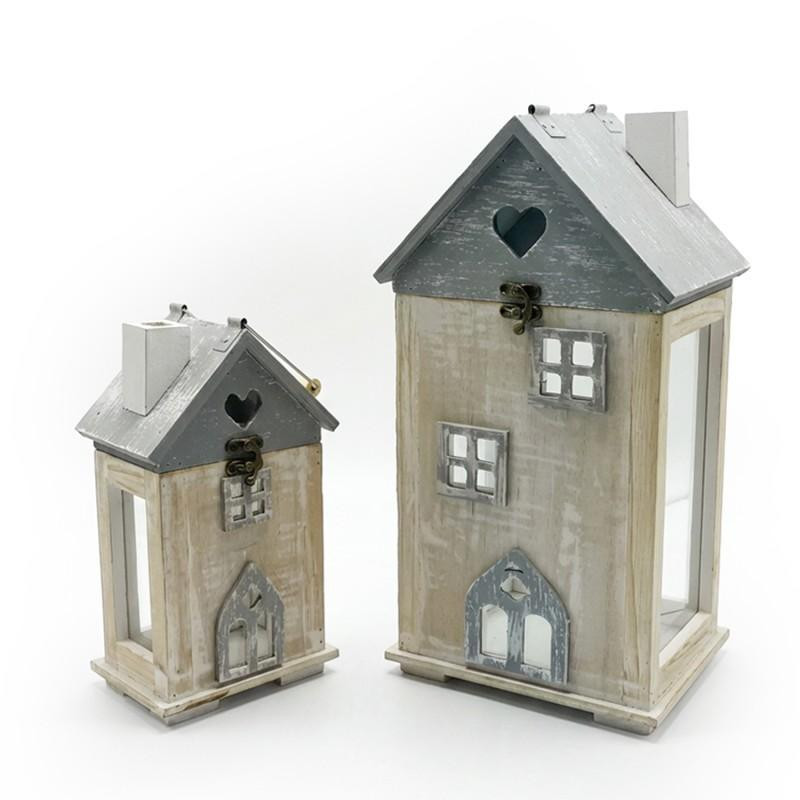 Set de 2 faroles con forma de casa de madera en blanco y gris 38x20x16 cm