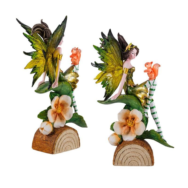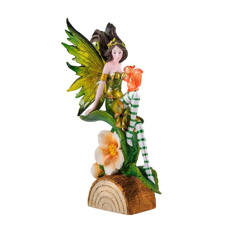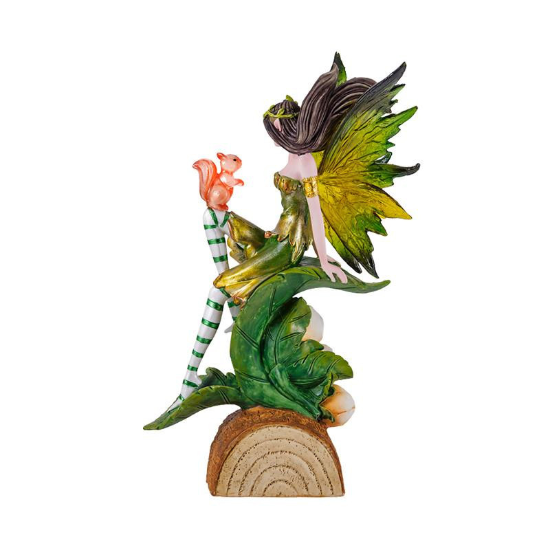 Figura hada verde sobre tronco con una ardilla de resina pintada a mano 21 cm