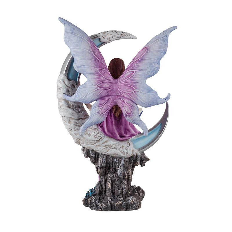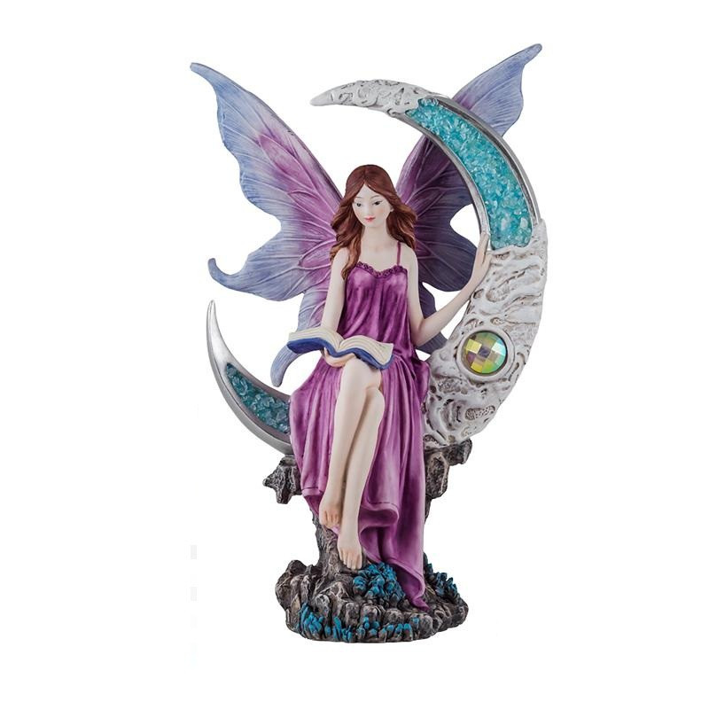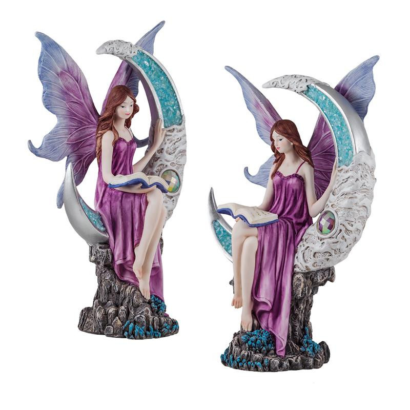 Figura hada sobre la luna leyendo azul y morada de resina pintada a mano 19x30 cm