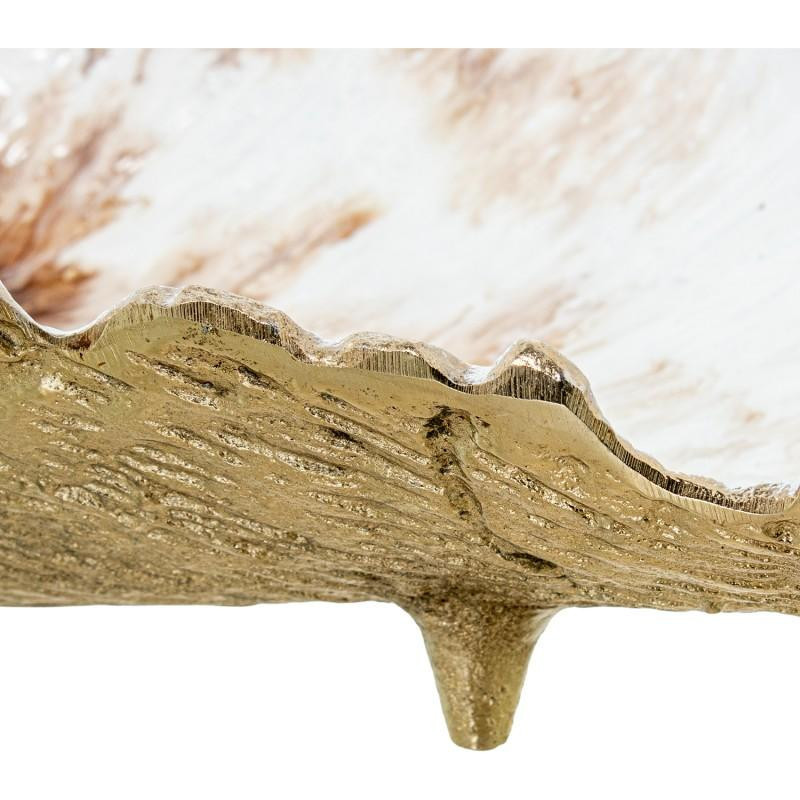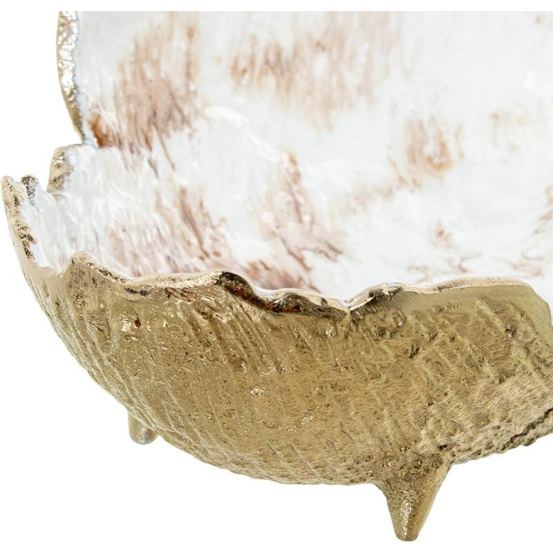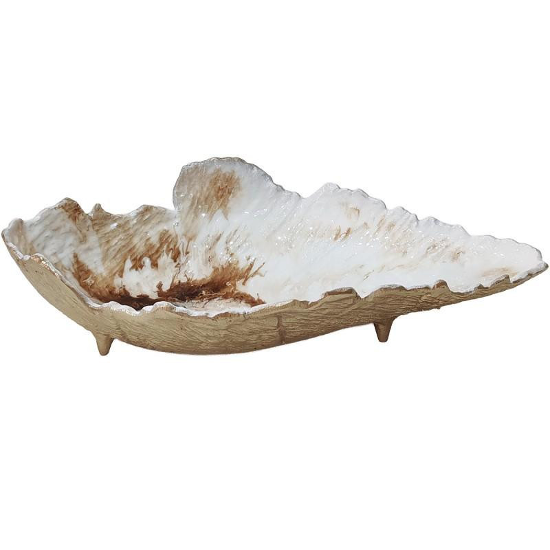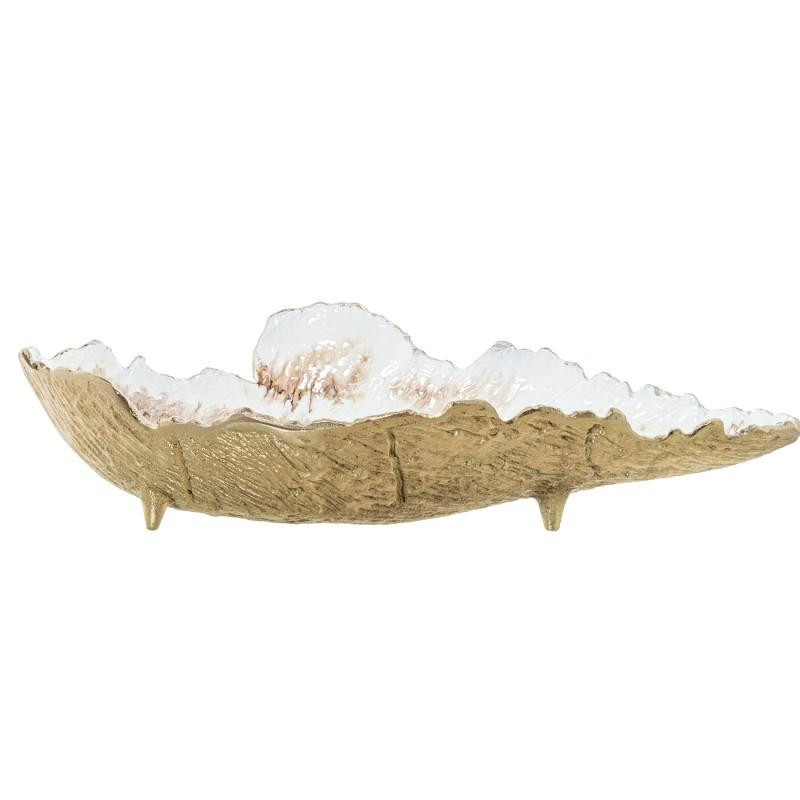 Centro decorativo de mesa con forma de hoja de aluminio en dorado y blanco. Medidas: 46x23x11cm