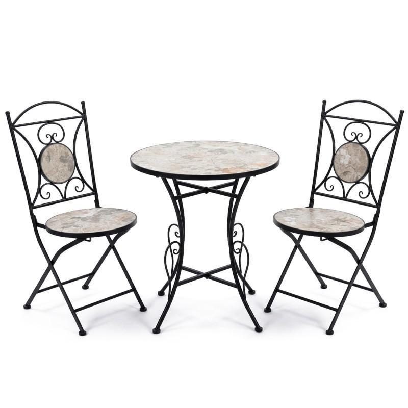 Set de mesa y 2 sillas de jardin de metal y piedra en negro, gris y blanco 72x60x60 cm