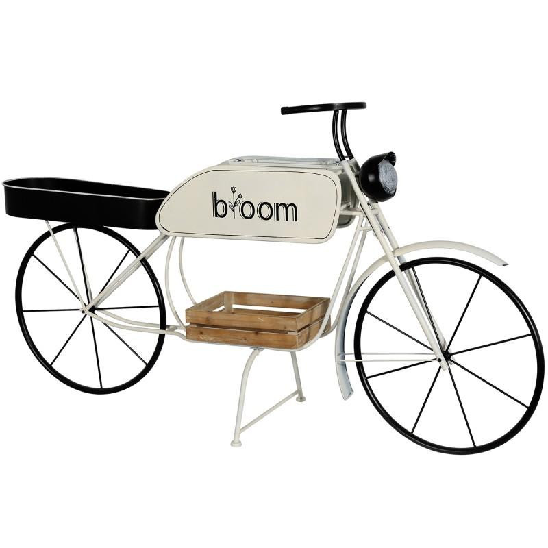 Moto vintage jardinera con bandeja de madera en blanco, negro y natural. Medidas: 188x57x103cm