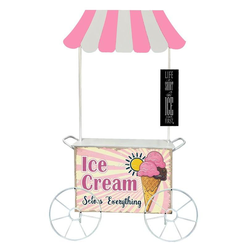 Carrito de helados jardinera de metal en blanco y rosa. Medidas: 149x39x213cm