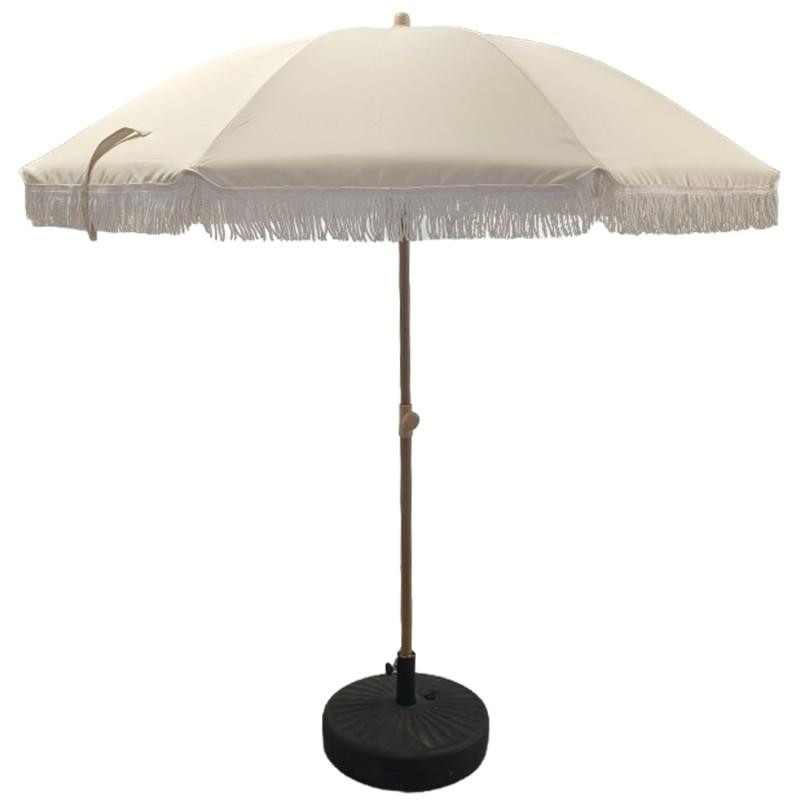 Parasol de acero y poliester con flecos en blanco. Medidas: 195x195x205cm