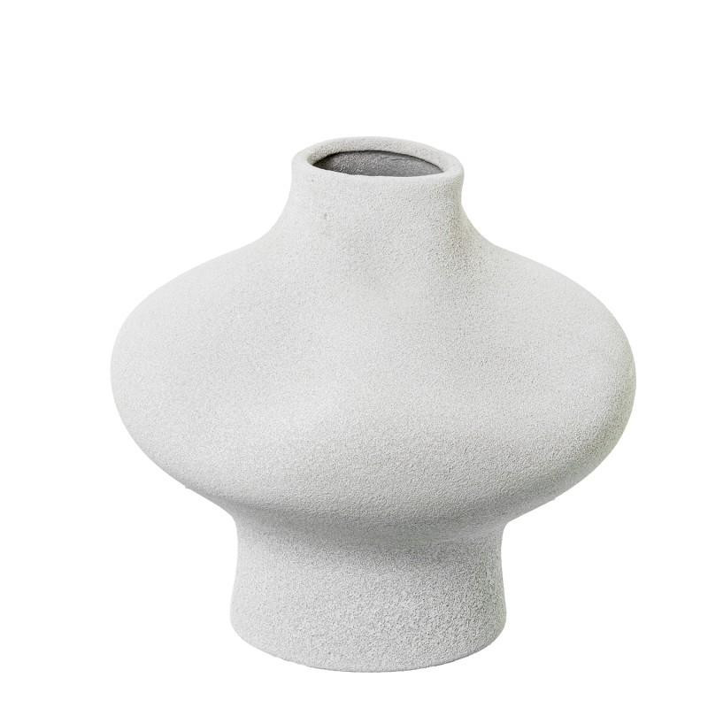 Jarron de sobremesa con forma redondeada de ceramica organica gris arena. Medidas: 30x30x26 cm