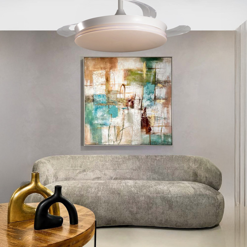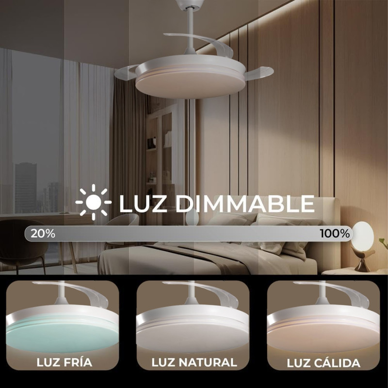Lampara de techo con ventilador de techo con luz con aspas rectractiles blanca. Medidas: 106x106x45 cm