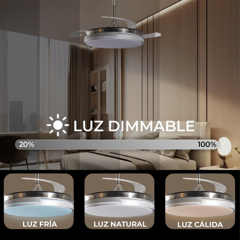 Lampara de techo con ventilador de techo con luz con aspas rectractiles plateada. Medidas: 106x106x45 cm
