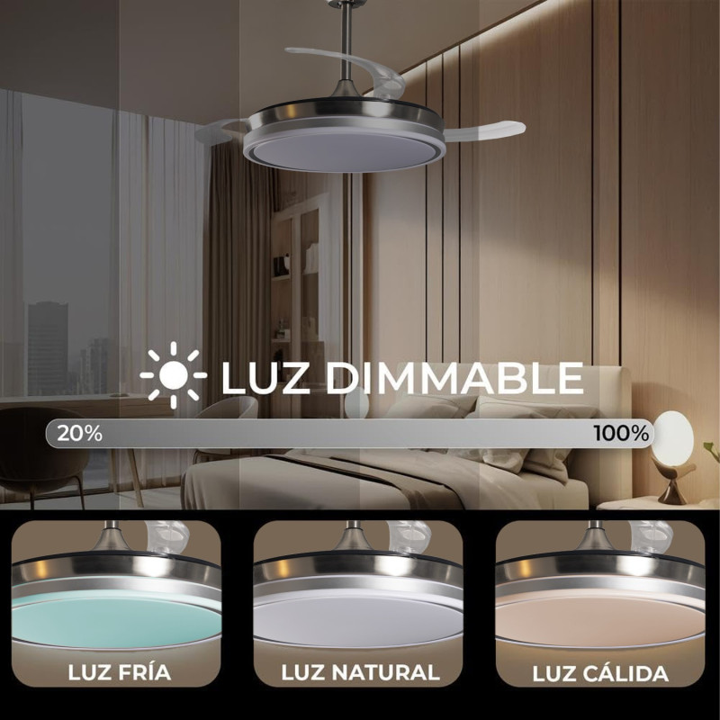 Lampara de techo con ventilador de techo con luz con aspas rectractiles plateada. Medidas: 106x106x45 cm