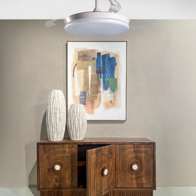 Lampara de techo con ventilador de techo con luz con aspas rectractiles blanca. Medidas: 106x106x45 cm