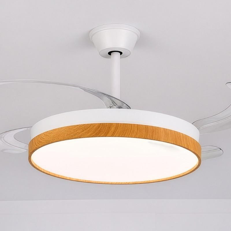 Ventilador de techo con luz y 4 aspas retractiles en blanco y madera aurora. Medidas: 106x106x53cm