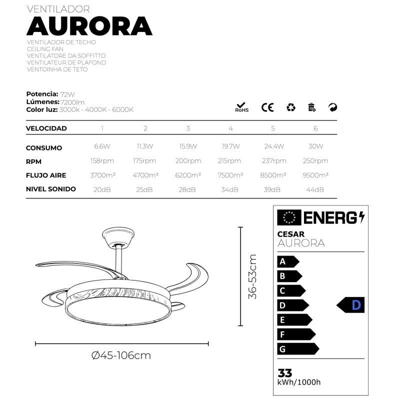 Ventilador de techo con luz y 4 aspas retractiles en negro y madera aurora 53x106x106 cm