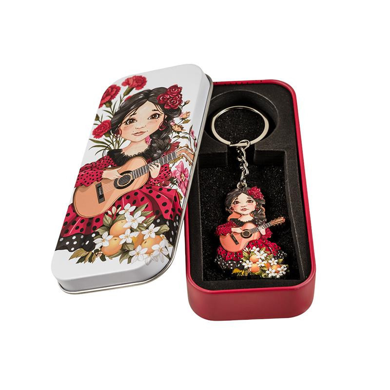 Llavero niña flamenca en caja de metal. Medidas: 1x5.5x2 cm