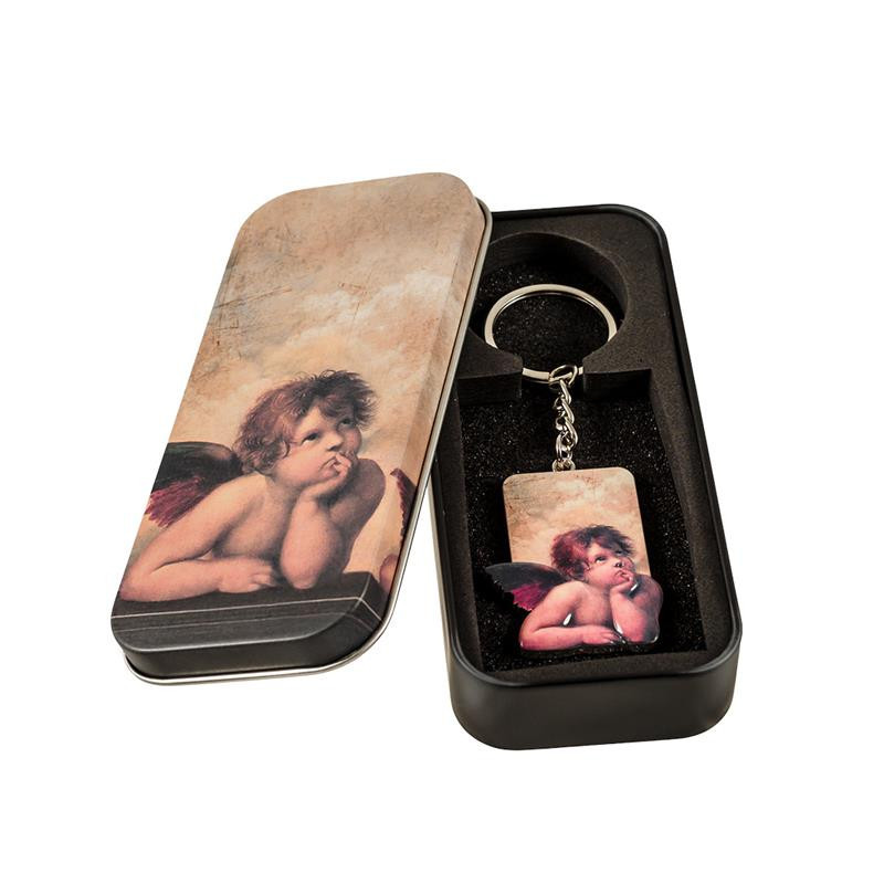 Llavero arcangel San Rafael en caja de metal 4x1x5.5 cm