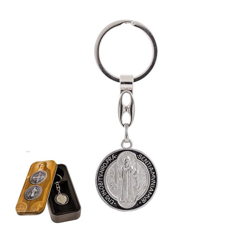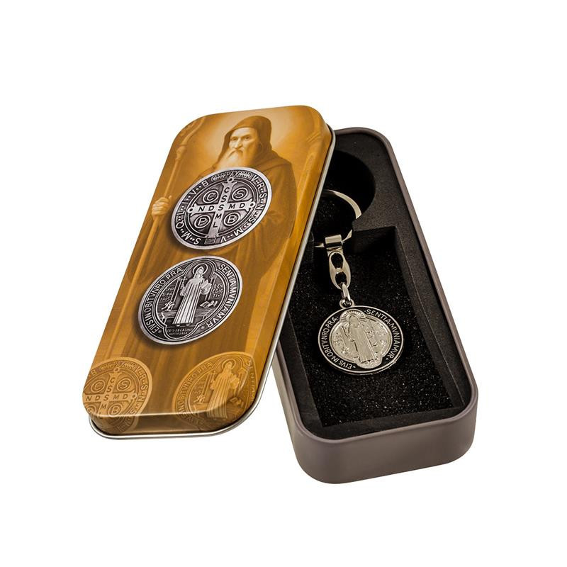 Llavero Medalla San Benito en caja de metal 3x1x3 cm