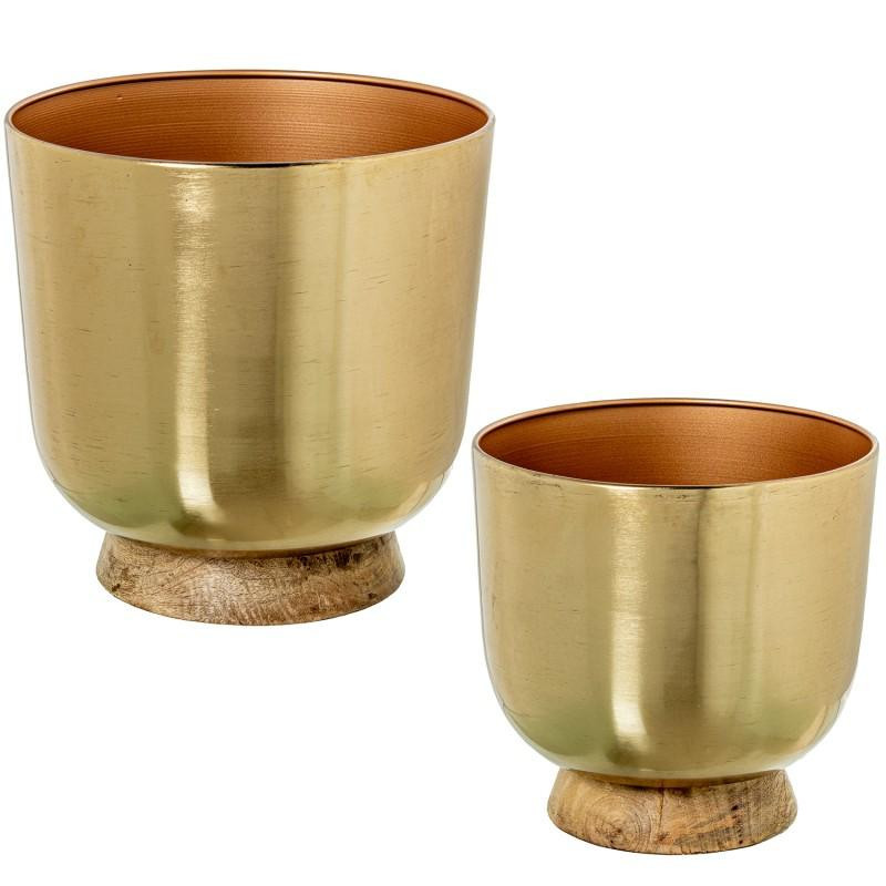 Set de 2 maceteros con base de madera y metal en dorado 30x30x30 cm