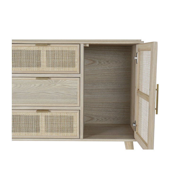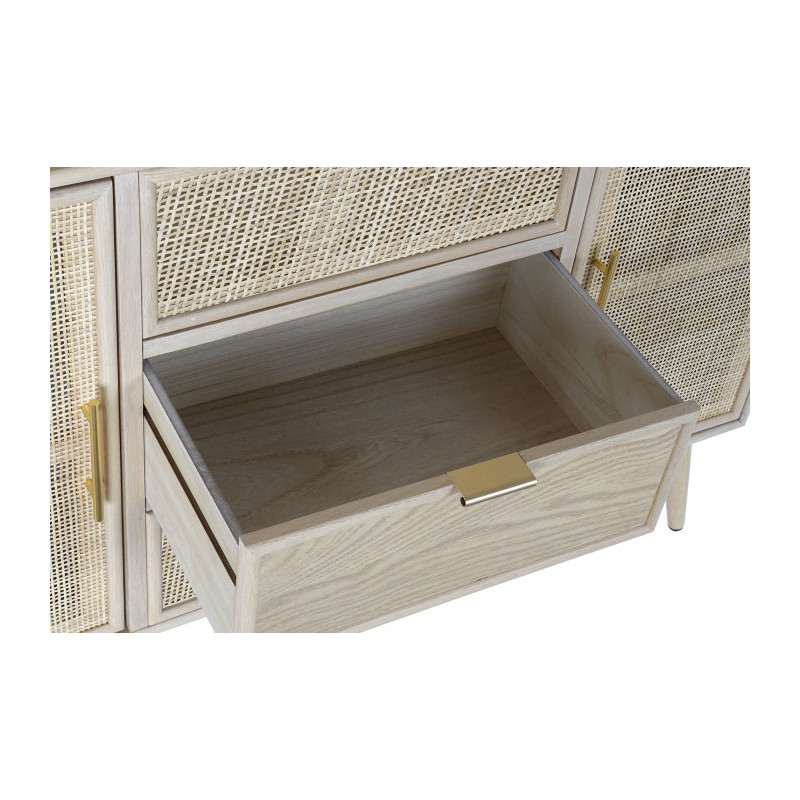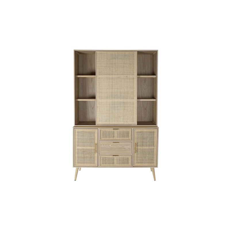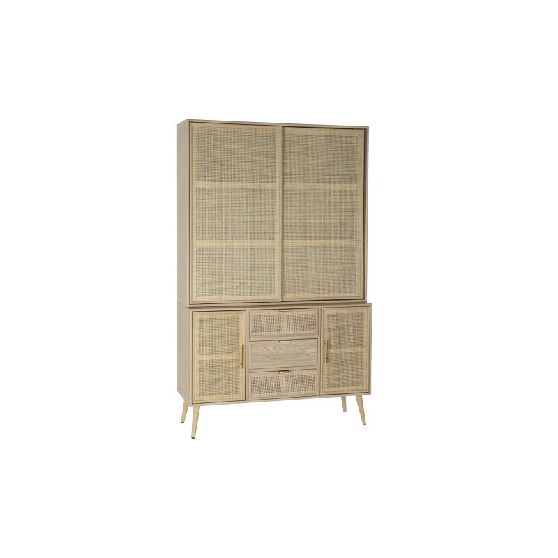 Vitrina 2 puertas con aparador de 5 cajones de madera y ratan 120x38,5x196 cm