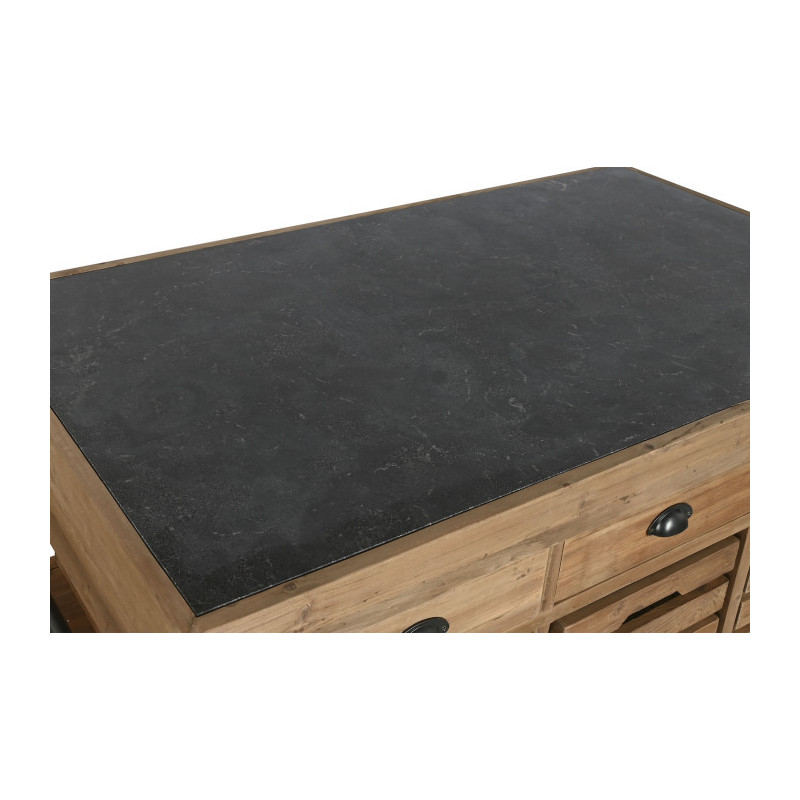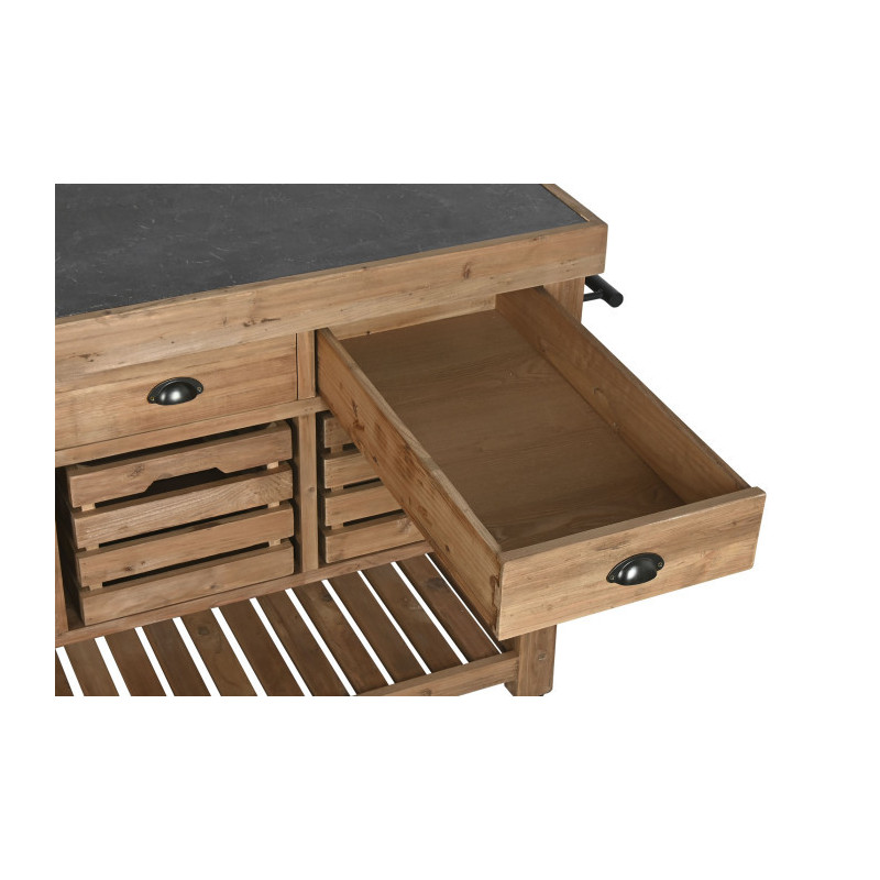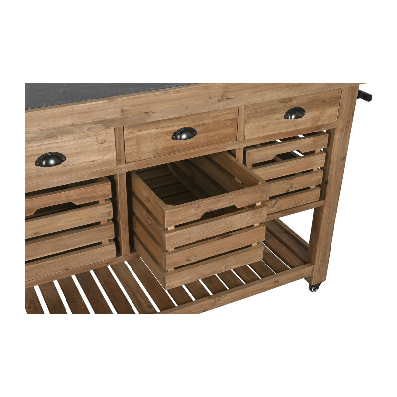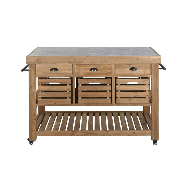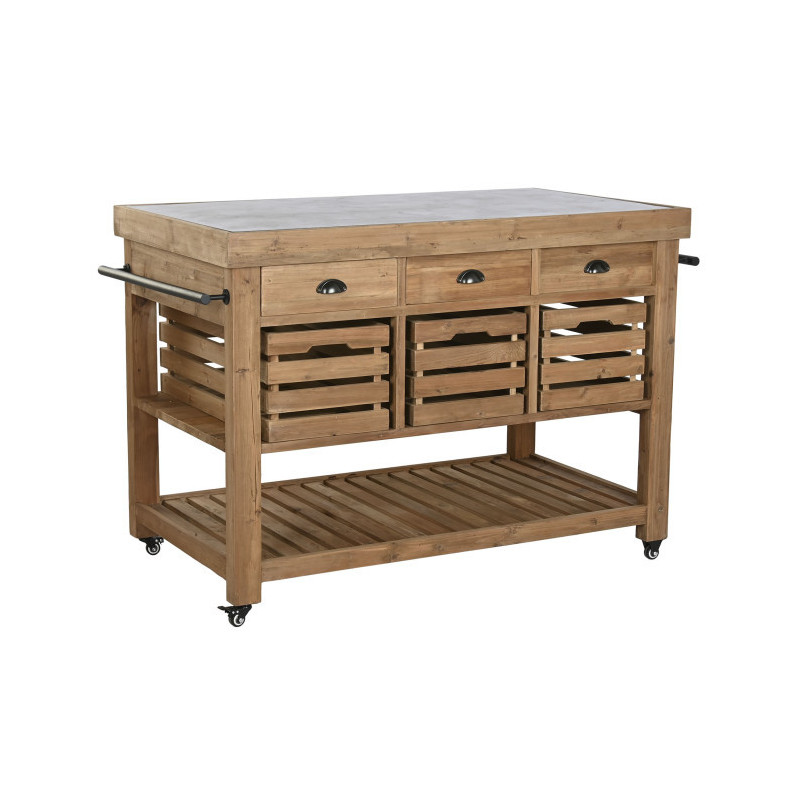 Mesa isla de cocina con cajones, cubetas, estantes y barras con colgadores de madera 142x75x96 cm