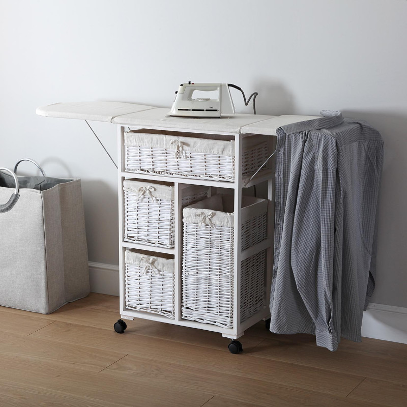 Mueble planchador blanco con cestos y ruedas 64x36x89 cm cerrado; 121cm x 32cm x 89cm