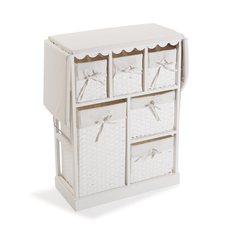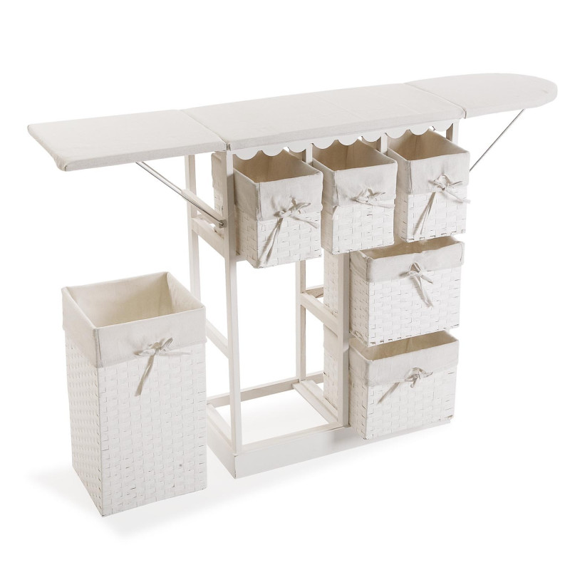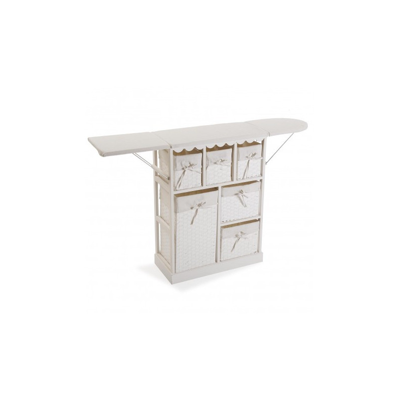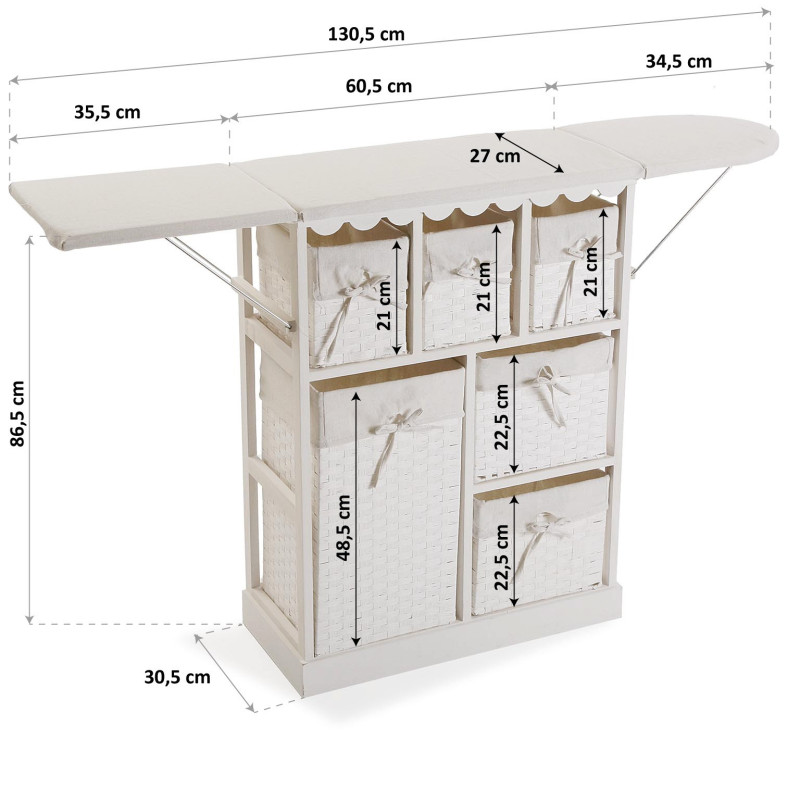 Mueble planchador blanco con cestos. Medidas: 130.5x30.5x86.5 cm abierto
