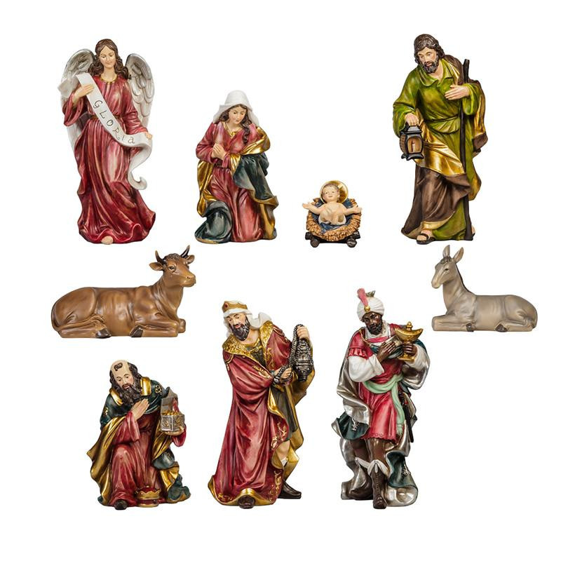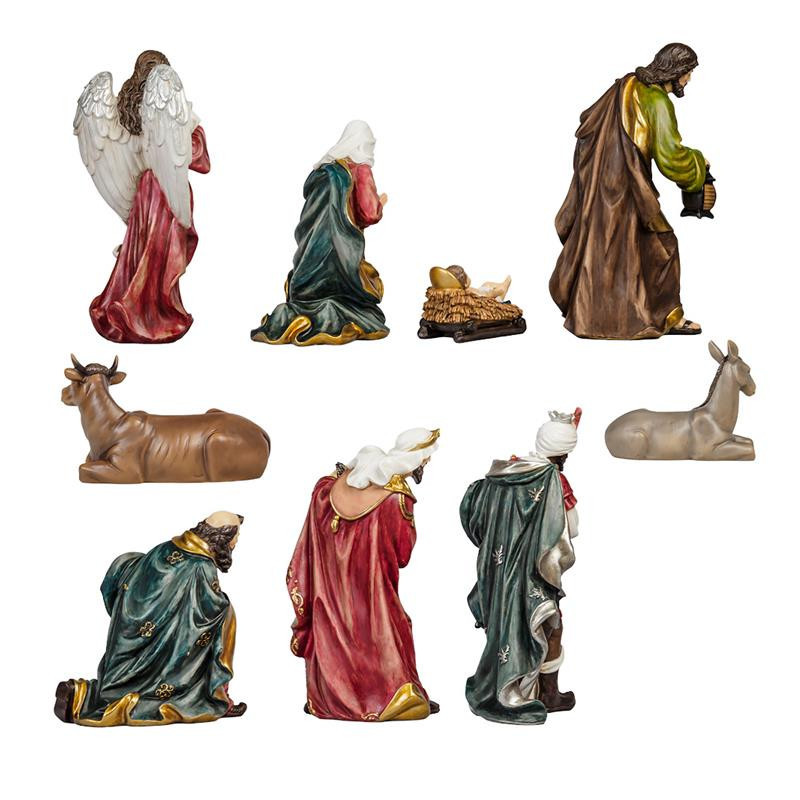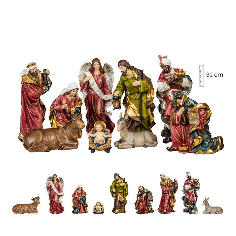 Misterio clasico tonos rojos de 9 piezas con reyes, animales y angel de resina pintado a mano 35 cm