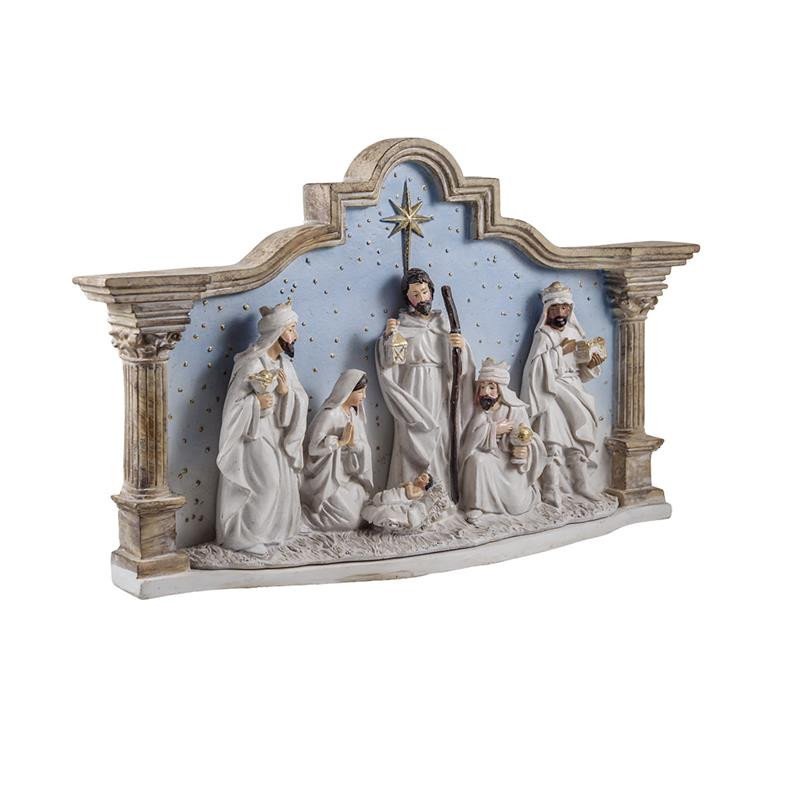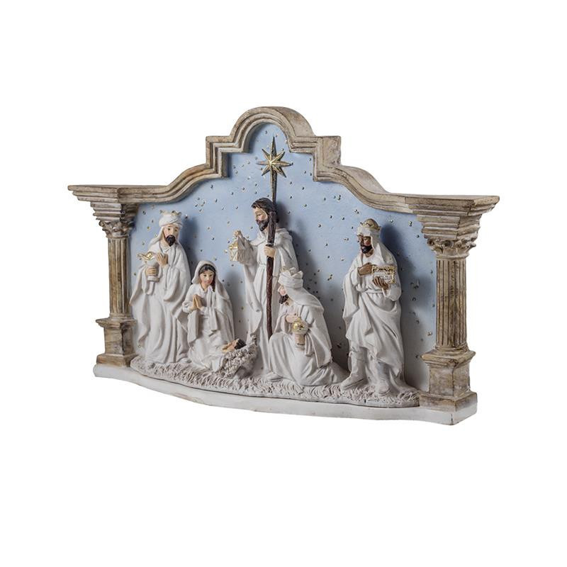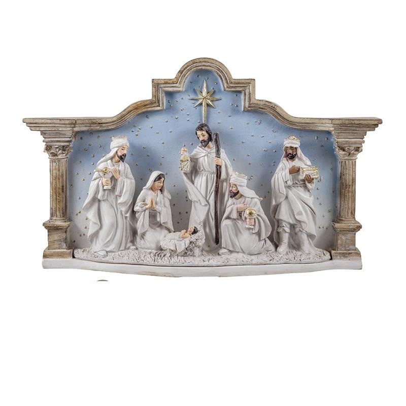 Misterio nacimiento de 1 pieza con los reyes adorando al niño con cielo estrellado azul y beige de resina pintado a mano 37x4x22 cm